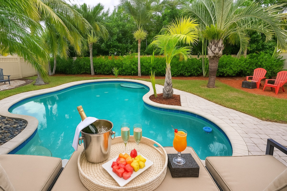 Your Private Palm Paradise Awaits! 🌴 Dive into your heated saltwater pool, unwind in the outdoor sauna, and break a sweat in your personal gym — all under the palms. Catch a movie under the stars from the cozy gazebo, or dine by string lights with a sunset backdrop. Take a moonlit swim, then spin old-school vinyls on the record player as the night winds down. The perfect getaway for families, friends, and anyone ready to relax, recharge, and make memories. 🌞