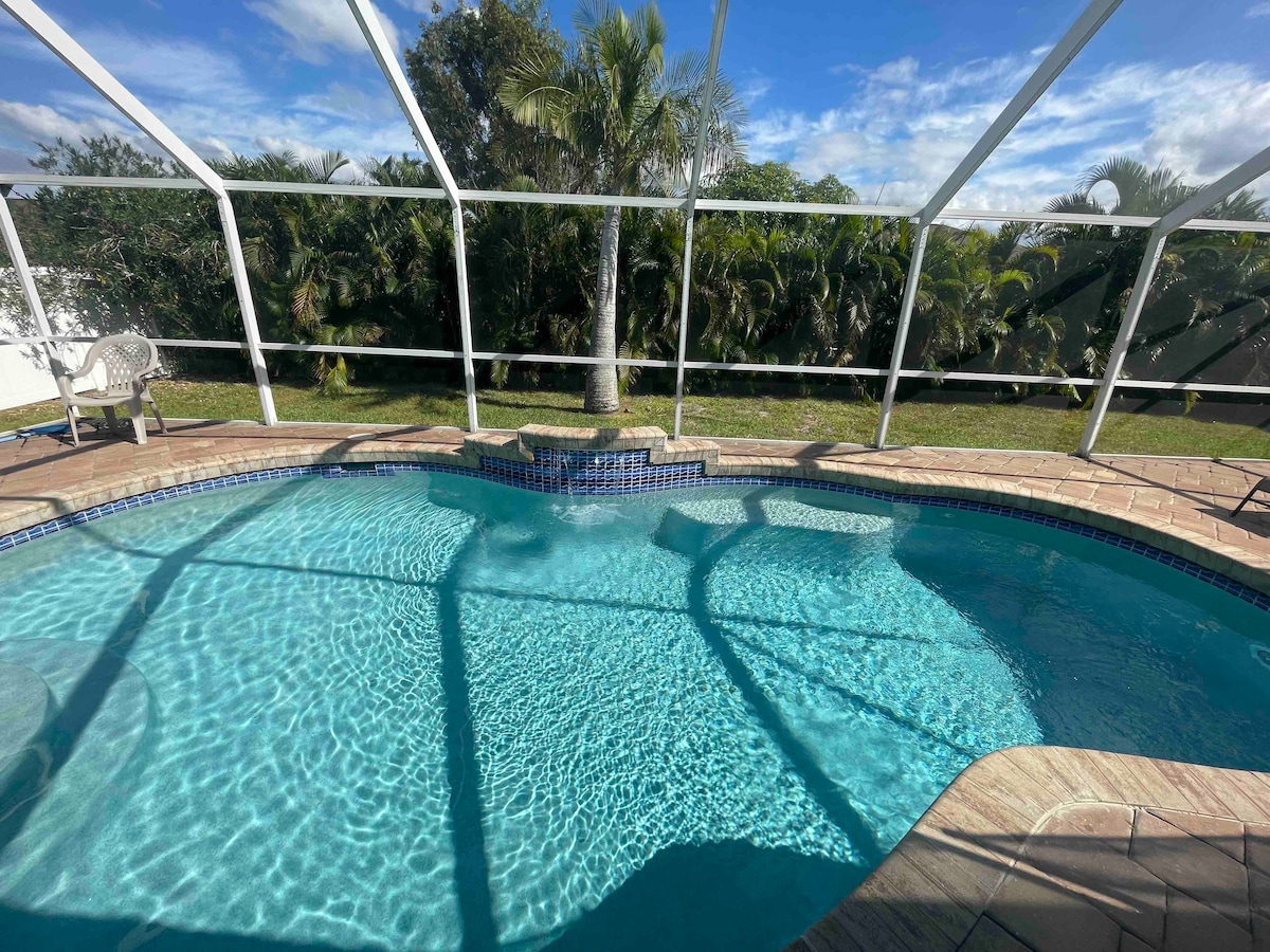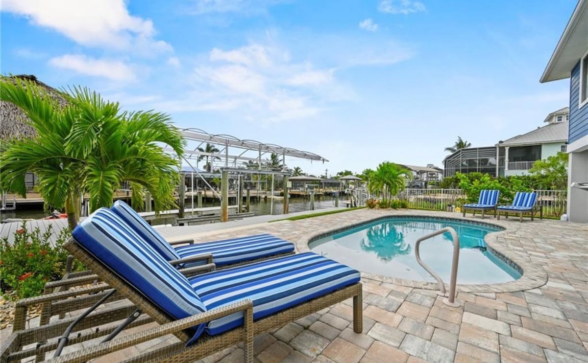 Beautiful 3 Bedroom, 3 bath home on a canal with a dock! Bring your boat or jet skis! Enjoy a relaxing stay watching the dolphins and manatee right off the dock. This exquisitely updated home has everything you need for a fantastic vacation. Especially location! 5 minutes to Ft Meyers Beach. Enjoy the resort right in your own backyard. New pool with hot tub and sun shelf. Enjoy beautiful sunsets off the huge patio. Trolly to beach at neighborhood entrance or walk to in minutes.