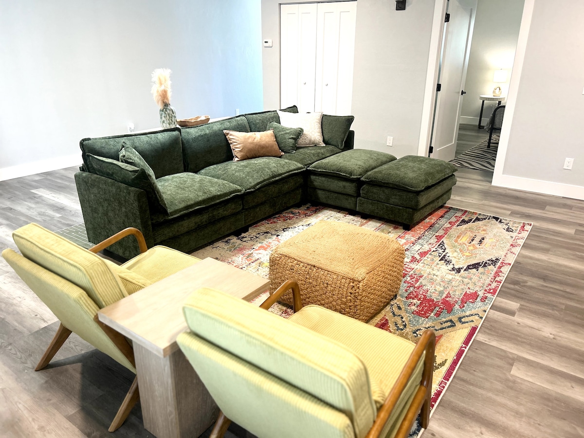 Relax near the beach at this peaceful place to stay. This quiet upstairs unit is newly remodeled with new appliances and quartz counters! Enjoy sitting on your private porch or rent both sides with friends and open up the privacy door between the porches. This unit sleeps 4 people with: King bedroom Queen futon in living room Additional living space can be rented with downstairs unit that sleeps 8 and other upstairs unit that sleeps 4 (mirror image of this unit).
