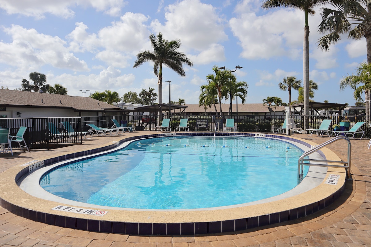 Located in Sun Retreats Fort Myers Beach (formerly Indian Creek), just 3 miles from Fort Myers Beach, Bunche, and Sanibel Island, and Margaritaville. The property offers amenities, including pools, pickleball, tennis, and numerous activities. It’s a great location, away from the main beach traffic but still close to shopping, and you can bike or walk to the beach. The trolley also stops right at the entrance. The bungalow features a fully equipped kitchen. Must be 35 to book, park rules.