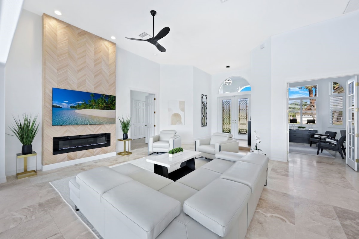 Komplett renoviert und neu eingerichtet! Erleben Sie die schönsten Wochen in der brandneu durch ein professionelles Designerteam komplett renovierten Villa Sunset Serenade II. Das mit einem tollen Lichtkonzept ausgestattete offene Wohnzimmer mit der nagelneuen großen modernen Küche der Ess- und Kochinsel sowie mit Kamin und Großfernseher. Die große italienische Ledercouch mit den großen elektrischen Sessel erlaubt einen tollen Blick auf den breiten Kanal und laden zum genießen ein.