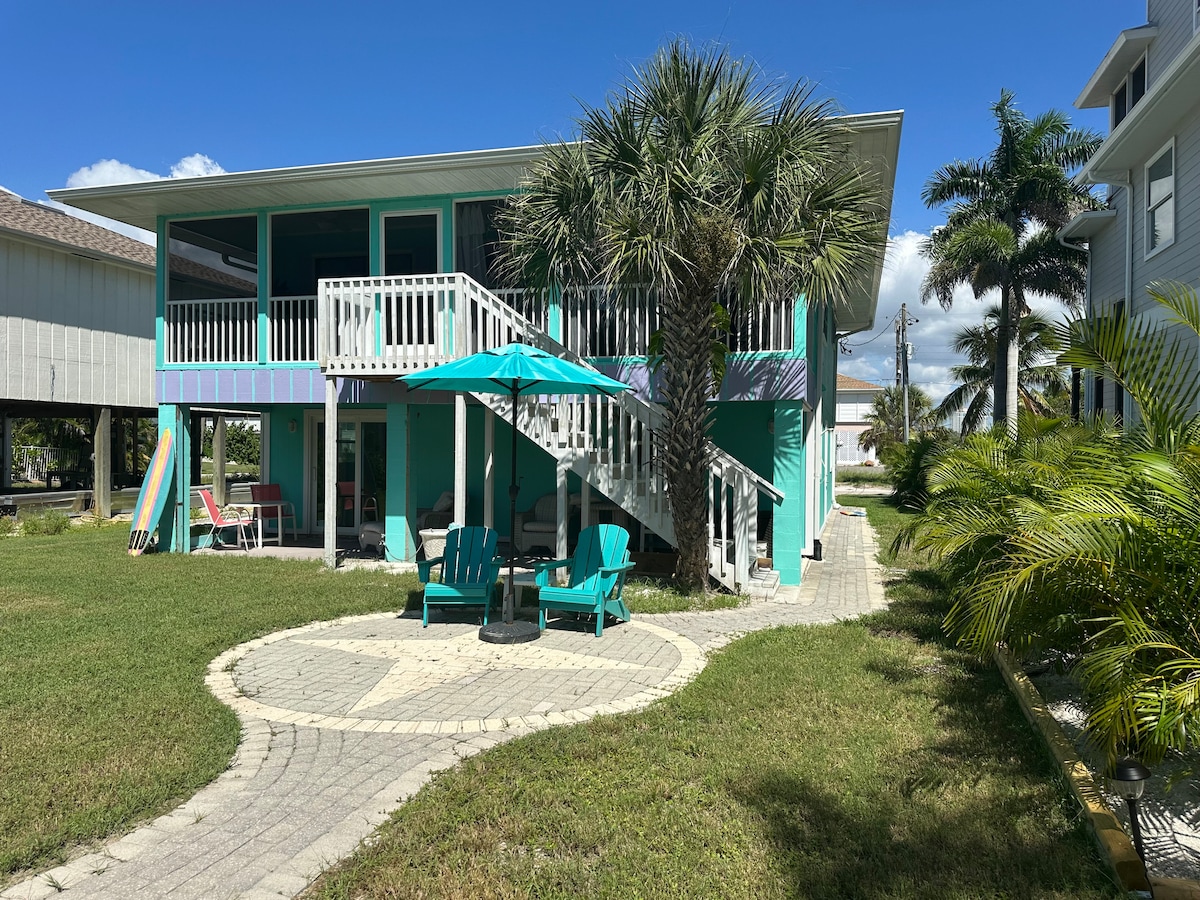 Welcome to The Beach, Baby! Your Beach Bungalow! Just cross the street to 6 mile long pristine beach! Tropical charming beach house in residential neighborhood with upstairs unit available to you. Light, Bright, Cheerful and Clean! Fully stocked down to blender, beach chairs, coolers,...Just bring toothbrush, bathing suit, and flip-flops! Huge covered/screened lanai facing west, which is great for sneaking a peak of sunsets , catching gulf breezes and outside dining.