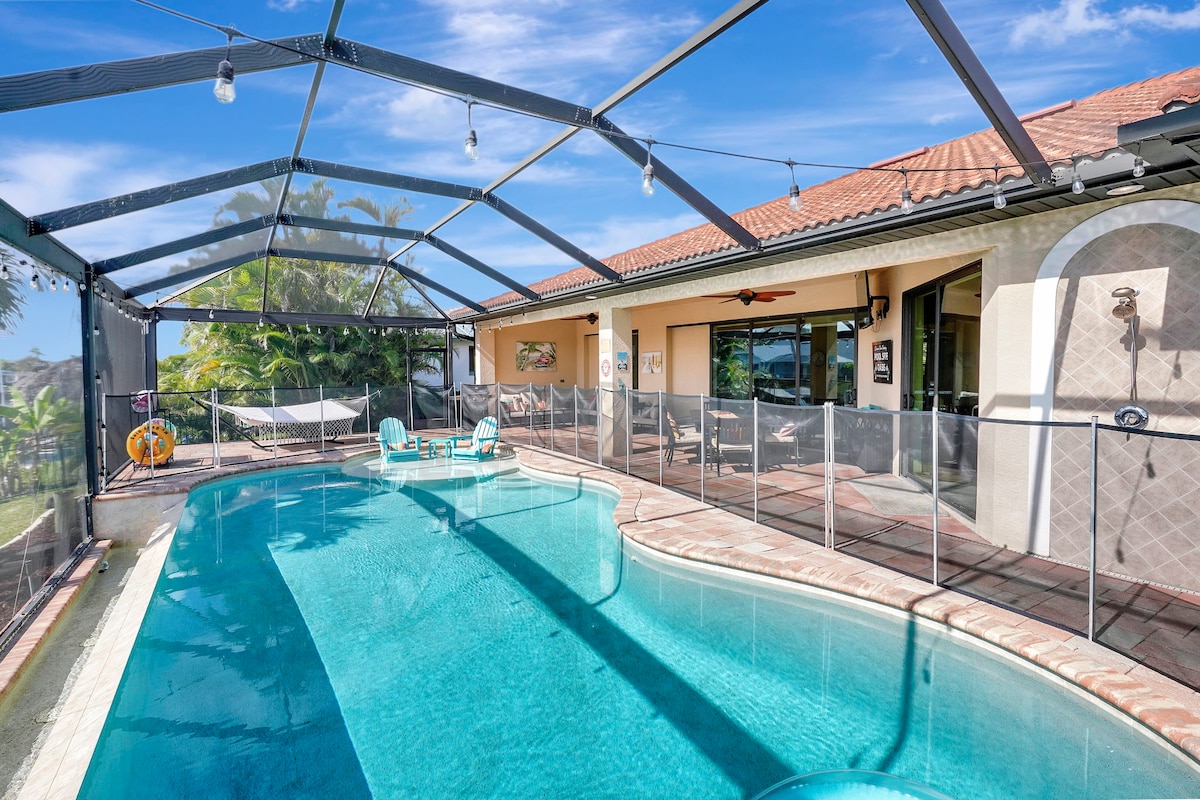 This spectacular 2358 sq. ft. Cape Coral waterfront home will exceed your expectations with its luxurious updates and abundant amenities. Located in a quiet neighborhood, but within minutes to shopping, grocery, restaurants, and beaches! Enjoy a large lanai with a heated pool and spa, outside TV and built-in grill. Includes kayaks, fishing poles, beach items, stroller, private driveway parking, Wi-Fi and printer. Gulf access with boat dock.