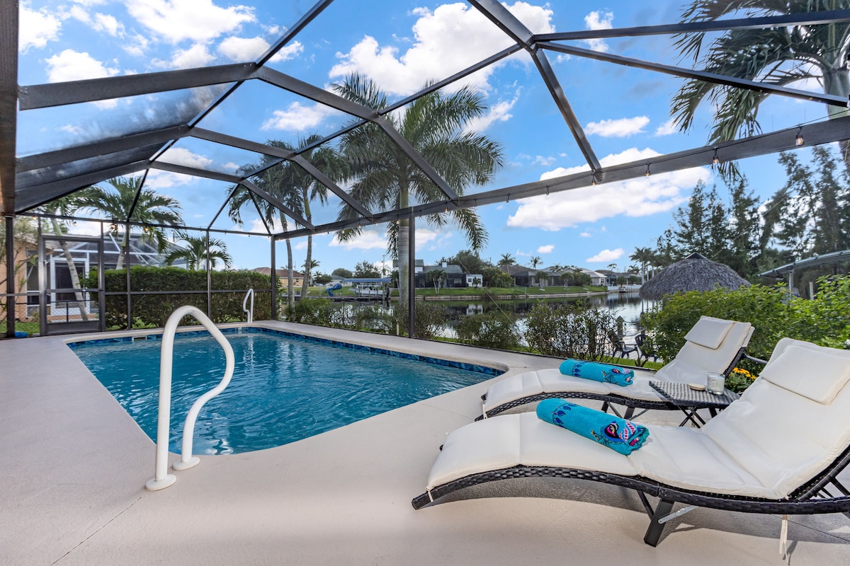 Villa Salt & Sol, an elegant, Coastal retreat in the yachting community of Cape Harbour, Cape Coral. Framed by stately royal palms - just 3 blocks from Camelot Park - Tennis/pickleball courts, playground/picnic areas, VILLA Salt & Sol blends upscale comfort w/coastal tranquility. • Gulf Access • 4 Kayaks • Dock w/13,000lb lift/Tiki Hut + glass bottom viewing area • Smart TVs in bdrms/2 liv rms/pool area • Beach/Fish Gear • Dog OK • Fenced yard • Free HTD Pool • Adults/Kids Bikes • Baby Gear