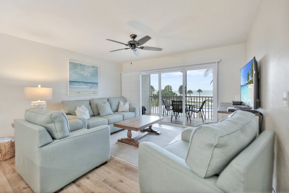 Sanibel Siesta looks amazing! Immaculate beachfront, 2BR, 2BA w/garage, nicely updated beachy unit at sand's edge. Amazing views of the Gulf with 5 star ratings! 3-day min. Sustained min. damage from Hurricane Ian. New hurricane windows, freshly painted with ELEVATOR IN BUILDING! Discount for weekly/mo. rentals. BR 1: King bed, en suite, smart TV. BR 2: 2 twin beds, smart TV. Qn. sofa bed in LR. Pool, golf course, bikes, laundry on site. No food or condiments stored in unit. May allow small dog.
