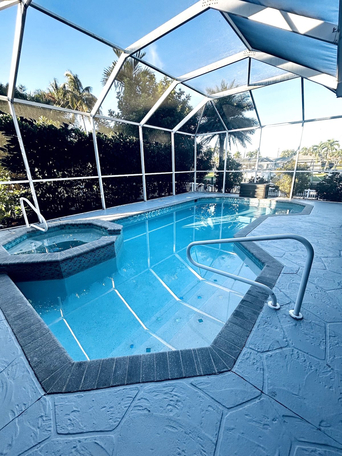 Welcome to Pelican House, a bright and spacious Florida getaway designed for family fun and total relaxation. This beautiful 4-bedroom, 2-bathroom home features a free heated pool and a sunny open layout, perfect for enjoying Cape Coral’s tropical lifestyle. Large sliding doors from the dining room, great room, kitchen, and master bedroom fill the home with natural light and provide direct access to the pool area — where you can swim, sunbathe, or enjoy meals al fresco. The screened lanai and c