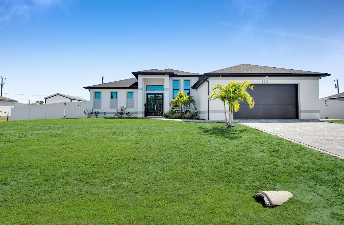 WELCOME HOME NEW REMODELED LUXURIOUS OCEAN BLUE THEME HOME IN PRIME QUIET SW CAPE LOCATION CAN WALK BIKE TO CAPE HARBOR NOW NO LONGER FOR SALE 3 BR 2 BA LARGE OPEN STOCKED KITCHEN LOTS OF NATURAL LIGHTS SS APPLIANCES, QUARTZ COUNTER TOPS 1 KING,2 QUEENS,TWIN SOFA RAIN SHOWERS W DEEP SOAK STAND-ALONE TUB SCREENED HEATED POOL heated 85 degrees LANAI TRAVERTINE 2 HAMMOCKS KEURIG W K-CUPS COFFEE SUPPLIES AIR FRYERS SLOW COOKER WEBBER GRILL YouTubeTV INTERNET 3 bikes AND beach chairs 15 MIN 2 BEACH