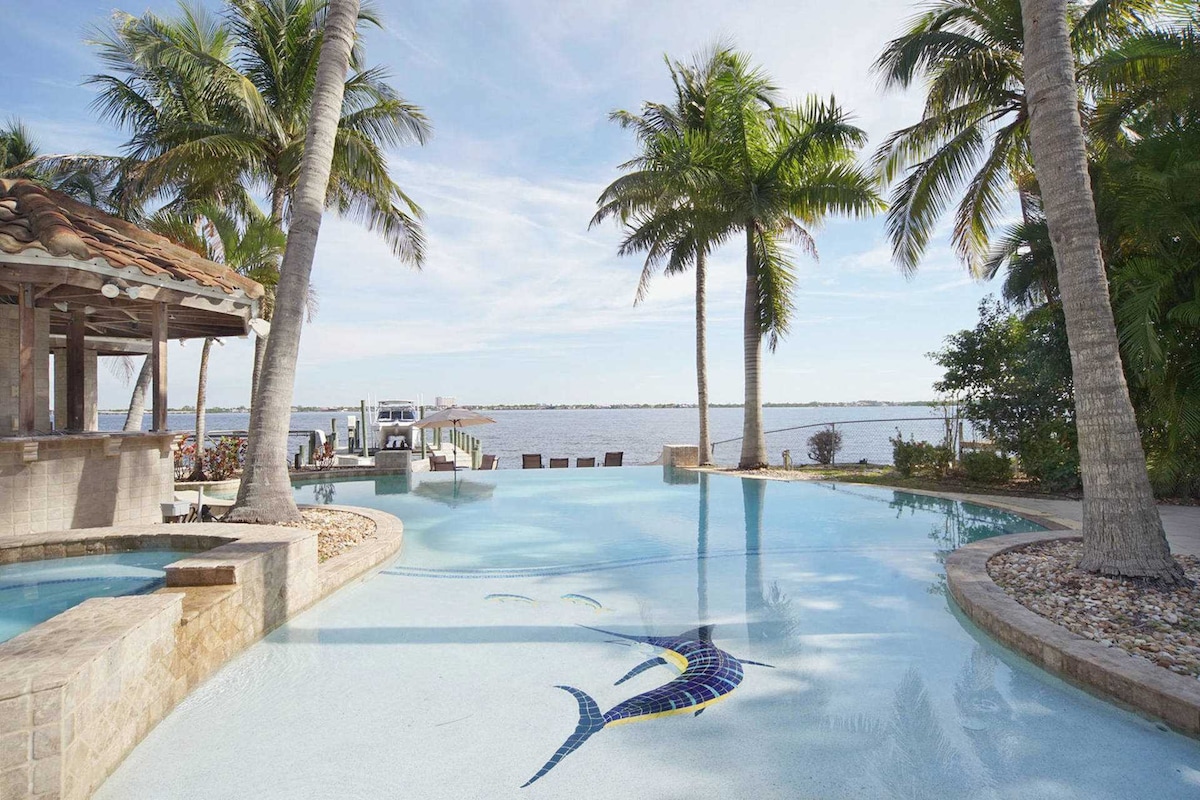 ONE OF THE BEST WATERFRONTS IN CAPE CORAL! A short walk to the beach a. This 2,500+sq ft home has stunning sunsets and South Western water views from all main living areas,as well as the Master Suite. Heated pool w/ LED colored lighting, built in Spa,Pool bath, full laundry facility, Lanai,Fireplace ,Wi-fi and TVs in every bedroom, private dock . Boat on lift for rent w/RPM rentals . Large 2-car garage w/5 bicycles,beach wagon & cooler on site.