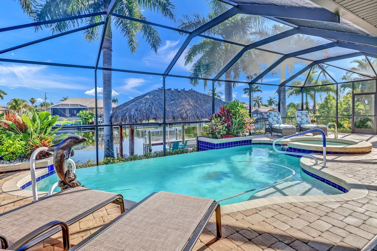 NEW!! Escape to the exquisite Villa Cecilia in SW Cape Coral! This meticulously designed 3-bedroom, 2-bathroom home on a gulf access canal promises a luxurious retreat. Dive into the refreshing pool, unwind in front of Smart TVs, and stay connected with complimentary high-speed internet. Step outside to a peaceful outdoor haven, ideal for relaxation and alfresco dining. Conveniently located near shopping and the vibrant Cape Harbor, this home offers both convenience and luxury. Deluxe amenitiies