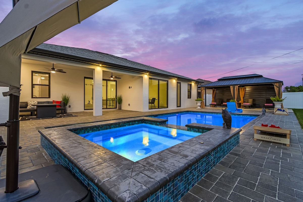 We want to Be you Host in Cape Coral! Let us show you why you should book with us: - Top Location: - 2 Min to Sun Splash Family Water Park - 20 minutos to Fort Myers Beach - 20 minutos to Sanibel Beach - New Hot Tub - 5 Smart TVs - Fast WIFI - Terrace with Gazebo - Fully equipped kitchen - Dedicated work space - Free Onsite parking - BBQ - Outside dining - Washer & Dryer - Playground - Games Room - Mini Golf - Beach towels - Residential Neighborhood - 24/7 Available Hosts