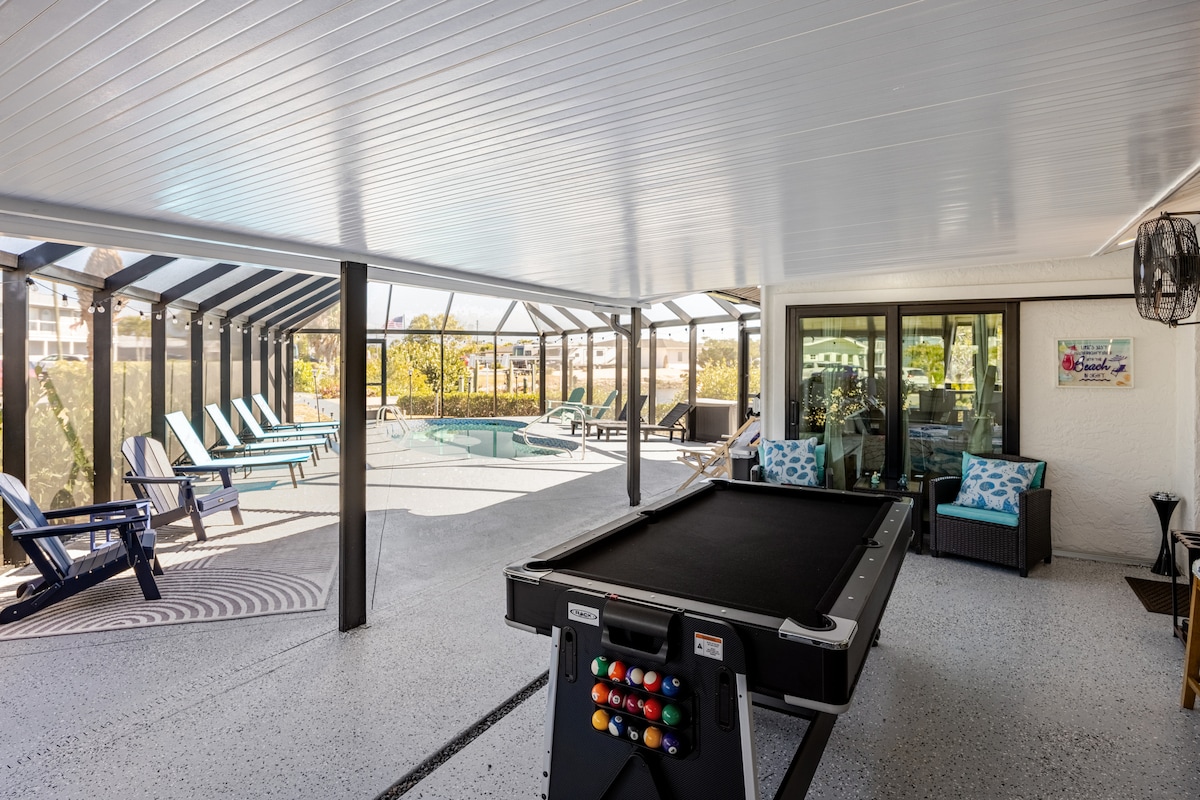 Renovated lanai! This 3 bed/4 bath home is on the nicest canal with 200+ ft of frontage & gorgeous views of the canal & sunset. The pool, tiki hut & docks have full sun all day. Each bedroom has a private bath & there's a 2 pc powder room off the laundry. The primary has a king bed & walkout to pool. The 2nd bedroom has a queen bed & pool access. Bedroom 3 has a queen & private bath. Fully equipped kitchen with everything you need. And a games room! Enjoy stunning sunsets under the tiki hut.