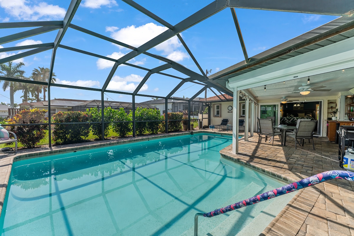 DISCOUNTS: Weeks...1=10%, 2=15%, 3=20%, 4=25%. Welcome to the "Oasis"! Escape to the water and stay on a canal in beautiful Cape Coral! Enjoy this 3 bedroom, 2 bath home. Swim in the pool, sit on the patio, fish from the dock, sit at the tiki bar for a drink, or take a nap on the lanai to get away from it all! There is a 50 foot long dock with 30 and 50 amps, so bring your boat! The Gulf is accessible by boat and Ft Myers Beach & Sanibel/Captive Island activities and beaches nearby!!