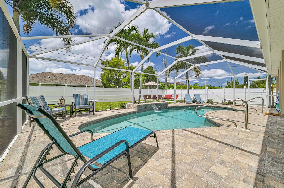 One-level, no-stairs Cape Coral home built with you in mind. Private heated saltwater pool with fountains + sun bench, fenced backyard, loungers Playset, and smart TVs in every bedroom. Sleeps 10 with 4 bedrooms & 2 full baths - has crib, pool toys, games, grill, and outdoor dining -easy self check-in, lounge chairs, umbrellas, gas grill. You will be close to lots of different cuisines within 5-10mins drive, 30 mins to the Gulf Shores beaches, 30 mins to the airport. Relax. Refresh. Rewind.
