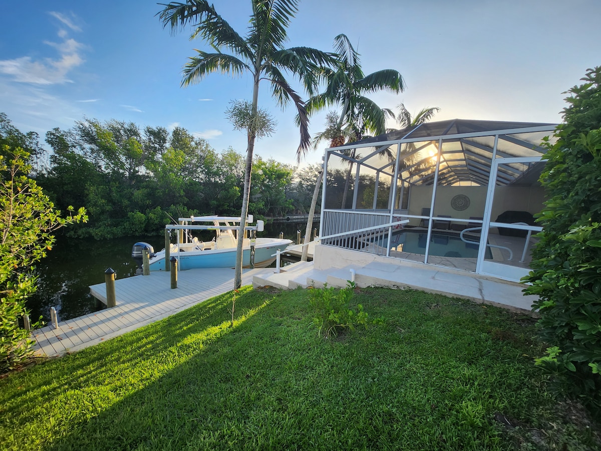 Our beloved Cape Escape House awaits for your family vacation in South Florida! Heated, screen-enclosed pool, huge corner lot waterfront fenced in, outdoor kitchen, Kayaks, Tiki Hut, and outdoor lana. Centrally located between Ft. Myers and miles of island beaches, two marinas, a downtown, and lots of great food & drinks. 4 bedrooms offer a King, 2 Queens, and 2 Twin beds, plus a den with two sofa sleepers and 2 full bathrooms! Two bedrooms allow for patio doors to pool.