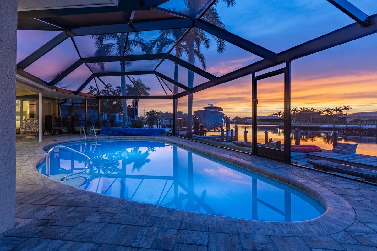 ONE OF THE BEST WATERFRONTS IN CAPE CORAL! A short walk to the beach a. This 2,500+sq ft home has stunning sunsets and South Western water views from all main living areas,as well as the Master Suite. Heated pool w/ LED colored lighting, built in Spa,Pool bath, full laundry facility, Lanai,Fireplace ,Wi-fi and TVs in every bedroom, private dock . Boat on lift for rent w/RPM rentals . Large 2-car garage w/5 bicycles,beach wagon & cooler on site.