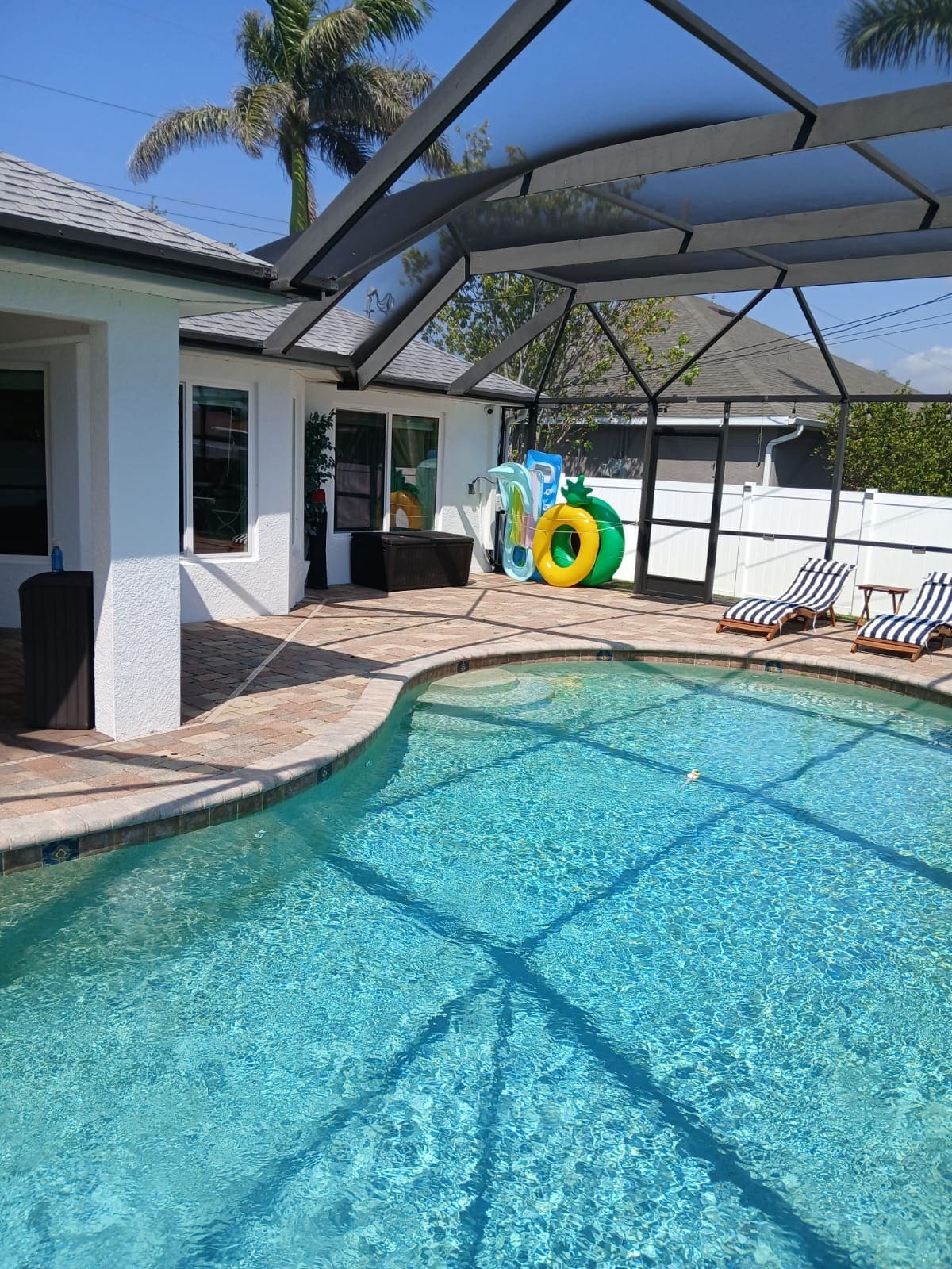 This is a great 3 bedroom 2 bath home in like new condition with all brand new furniture ready for you to relax in. This home is located in Southwest Cape Coral close to shopping, great restaurants, 27 hole golf course at Cape Royal. Located in a quiet neighborhood on an oversized 3 lot site with a huge private fenced back yard. Home has Wifi, cable TV, full lawn maintenance you do not need to do anything just bring your clothes and toothbrush everything you need is here.