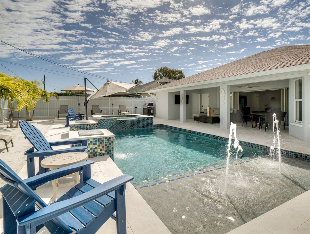 Relax with the whole family at this peaceful place to stay which features: *2200 Sq. Ft *10-foot windows and doors *Private large, screened in Lanai *Large heated SaltwaterPool & Spa *Outdoor kitchen, living room w/TV, and dining area *Fully stocked and equipped Kitchen *Nespresso Coffee Machine *Off street parking, driveway will accomodate 2 vehicles *Safe Neighborhood *On the canal. Room to tie up a boat or two *1 walkable Mile to coffee shops, and several restaurants