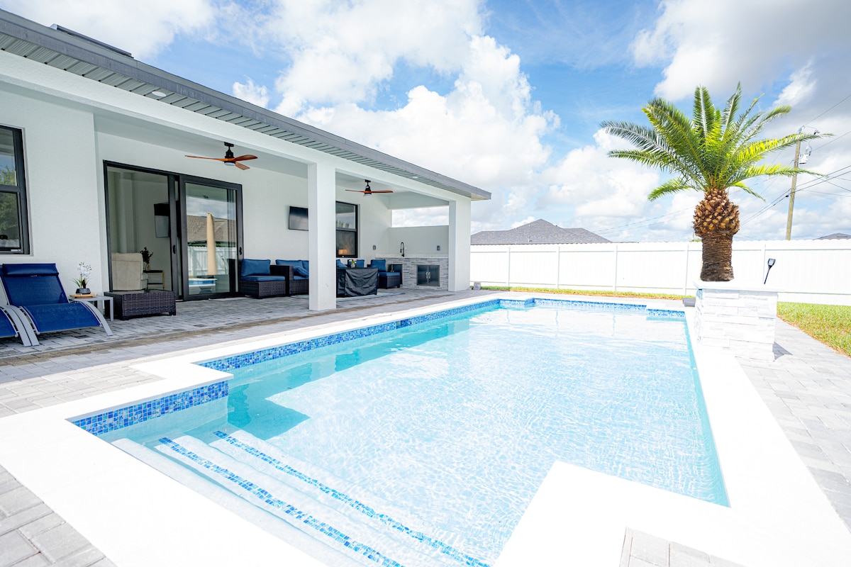 Find your peaceful retreat right here in beautiful Cape Coral, this lovely Oasis features all modern brand new amenities including gorgeous back patio with outdoor kitchen, dining, pool, fenced yard. Sun and sip on a cool drink. Relax and watch movies at the end of the evening in our comfortable large open living room. Cook a gourmet meal in the chefs kitchen. Rest in a comfortable and peaceful nights sleep on the luxury king bed, spacious room for the entire family sleeps over 9 people.