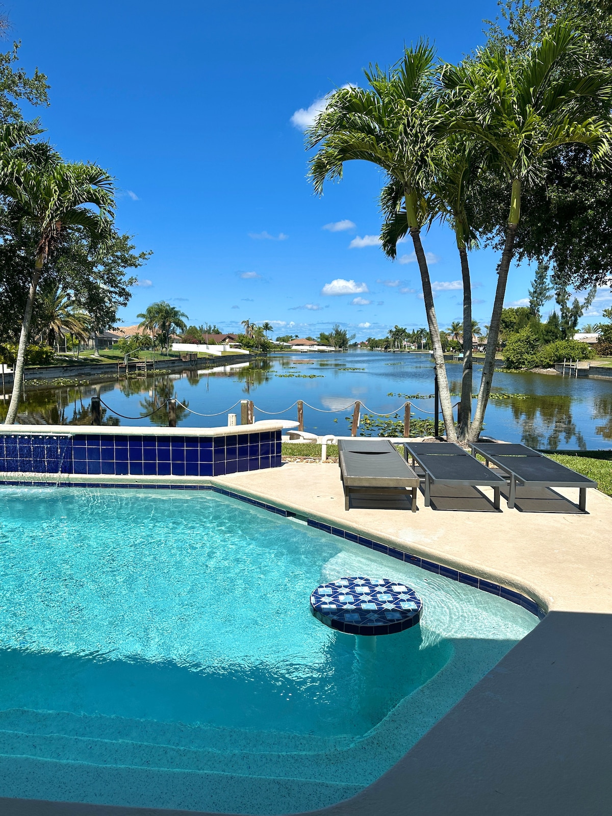 DISCOUNTS: Weeks...1=10%, 2=15%, 3=20%, 4=25%. Welcome to the "Oasis"! Escape to the water and stay on a canal in beautiful Cape Coral! Enjoy this 3 bedroom, 2 bath home. Swim in the pool, sit on the patio, fish from the dock, sit at the tiki bar for a drink, or take a nap on the lanai to get away from it all! There is a 50 foot long dock with 30 and 50 amps, so bring your boat! The Gulf is accessible by boat and Ft Myers Beach & Sanibel/Captive Island activities and beaches nearby!!