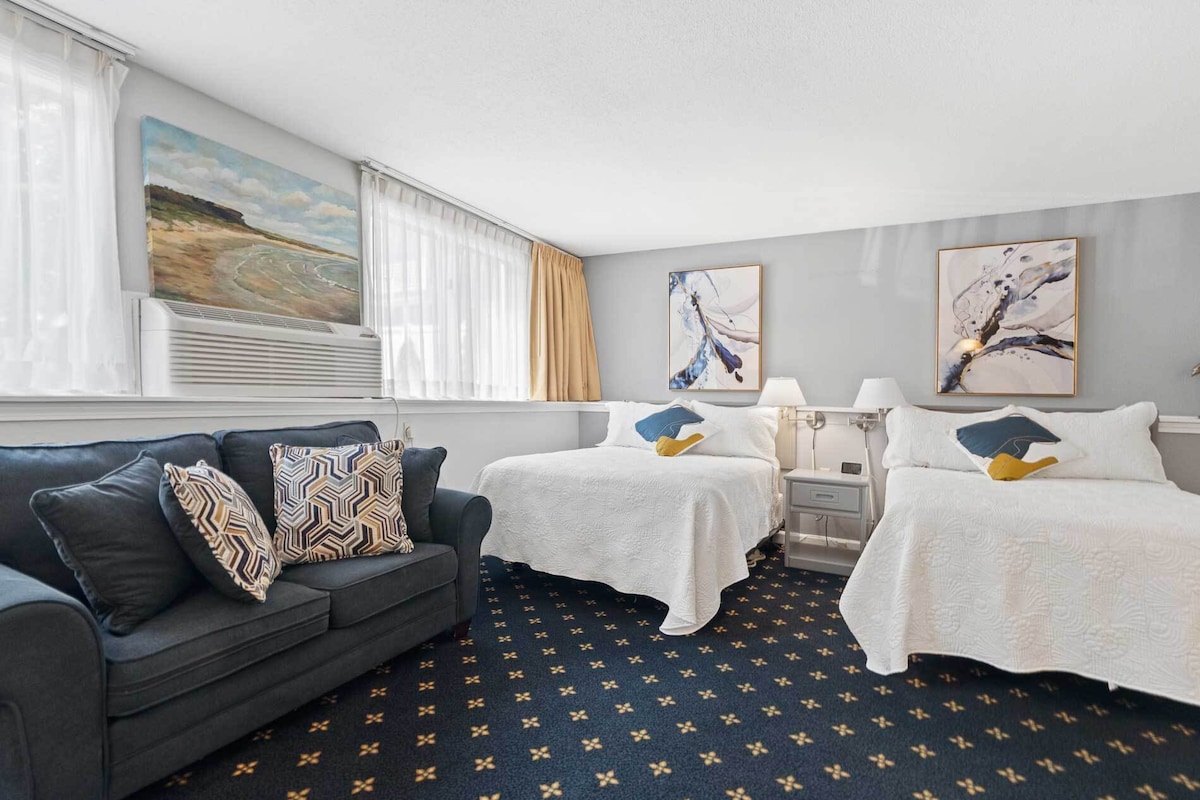 Our atlantic suite offers one King Bed and one Queen sleeper sofa with a spacious studio layout filled with stylishly designed furnishings. Rooms include LED flat-screen TV, mini fridge, luxury amenities, complimentary continental breakfast, and a view of our serene garden. A resort fee of 10% of nightly rate (plus tax) will be charged upon arrival based on stay dates.