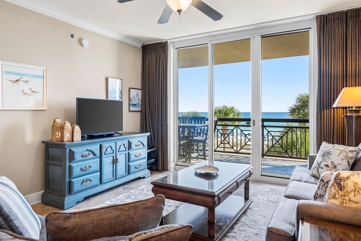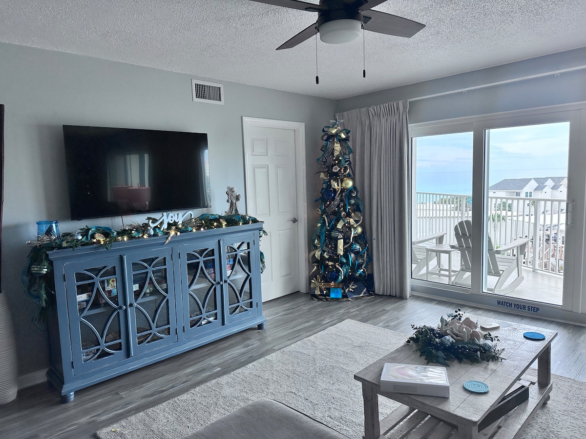 Recently renovated. **Oceanfront Condo with EXPANSIVE balcony to enjoy the picturesque view. Private beach access to the SUGAR WHITE sands. We supply BEACH CHAIRS, UMBRELLA, and TOWELS. The condo has all the comforts of HOME with two bedrooms, two full baths, and a fully equipped kitchen. Enjoy OCEANFRONT VIEWS from the king bedroom. Additional guests can rest on the queen sleeper sofa. The entire building had a full exterior renovation this year, and all new furnishings and fixtures inside!