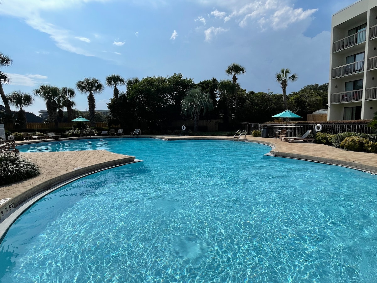 Plan your SUMMER at the BEACH! SNOWBIRDS message us for a monthly rate (Oct-Feb). Steps to the sand, Ocean view , top floor unit, sleeps 5,(queen bed, single day bed, and queen sofa sleeper). (USB port outlets, no carpet, stainless appliances, and keyless entry). A one minute walk to the white sand, wifi in the unit, 2 beach chairs, cooler, beach towels, and beach umbrella. Laundry onsite, Tom Thumb next door for items you might need. Everything for a great beach vacation! 683 Nautilus court