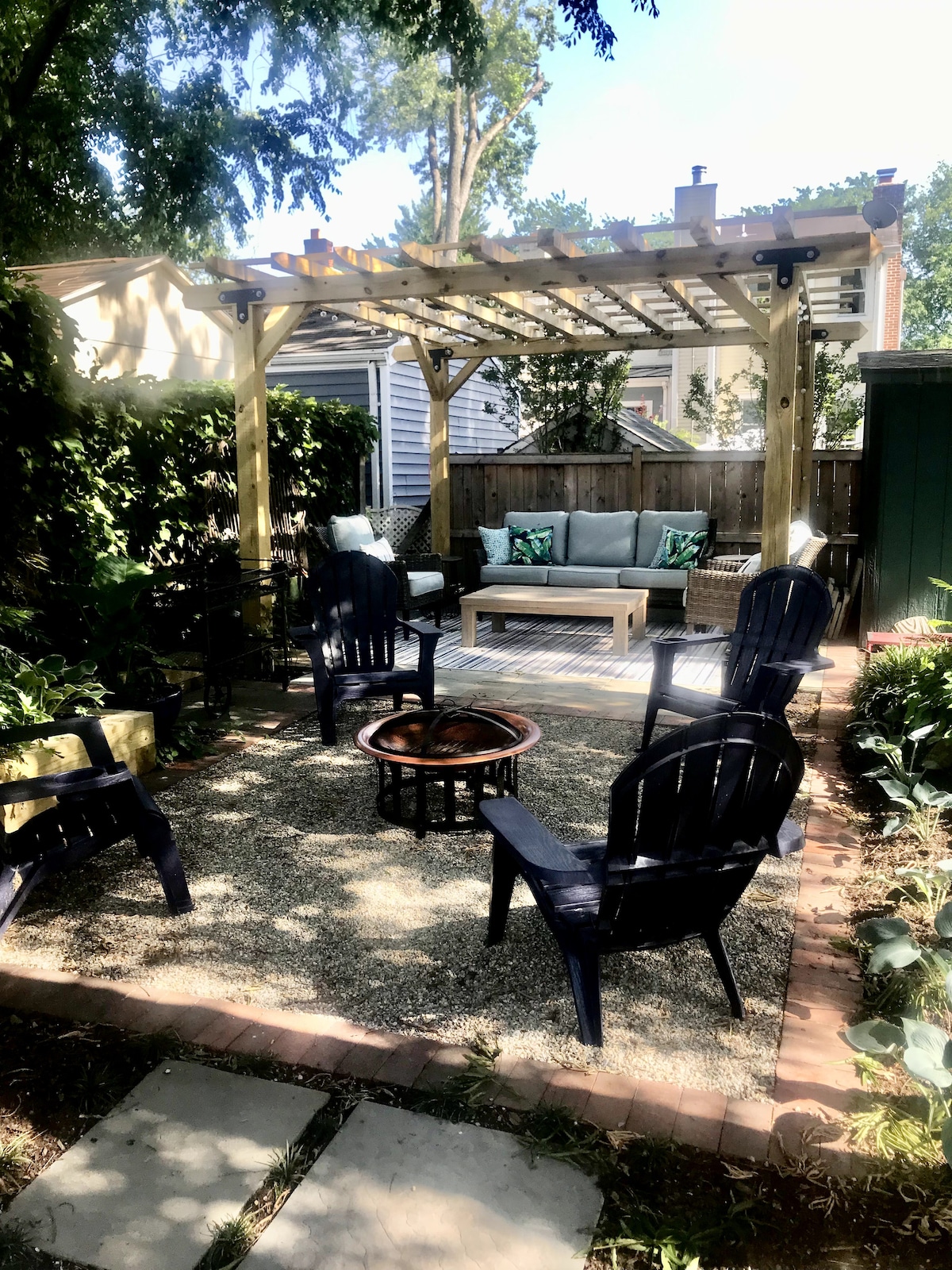 Walkers’ paradise: Five blocks to Metro for a quick trip into D.C. Three blocks to King Street—the heart of the Old Town historic district. California King Bed with a Casper mattress. Second bed is a futon in an office space off the bedroom. It is a one bedroom suite. New private patio and gas fire table. Private entrance, private bathroom. No check-out chores. No kitchen, but the suite is surrounded by dozens of restaurants and bars. We do have a small fridge and coffee bar. No microwave
