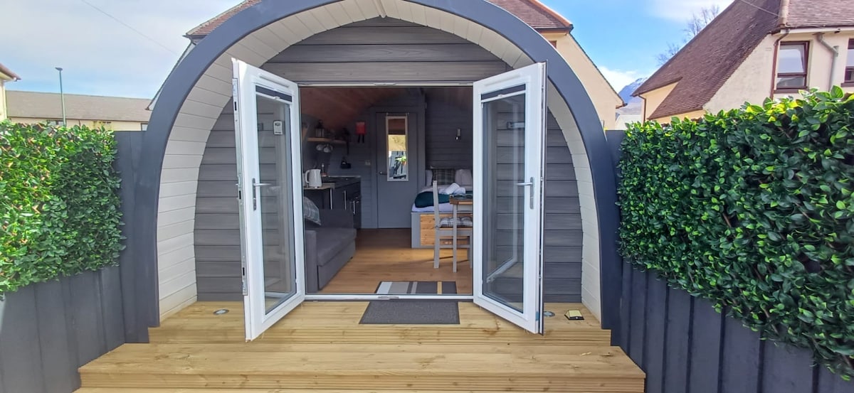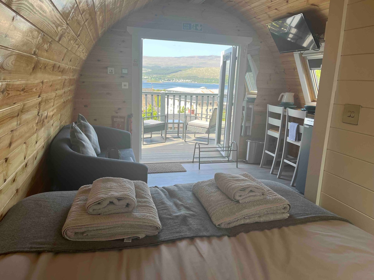 Situated in Caol, 2.5 miles from Fort William and 4-5 miles from Aonach Mor. Dearg Mor is a modern, self contained, en-suite cabin on the shores of Loch Linnhe situated on the Great Glen Way. There are stunning views of the surrounding mountains and Neptunes staircase is a 10 min walk away and, if you don’t fancy walking, there are HiBike electric bicycles for hire outside the shops close by accessible by app. Please note there are no cooking facilities in the cabin.