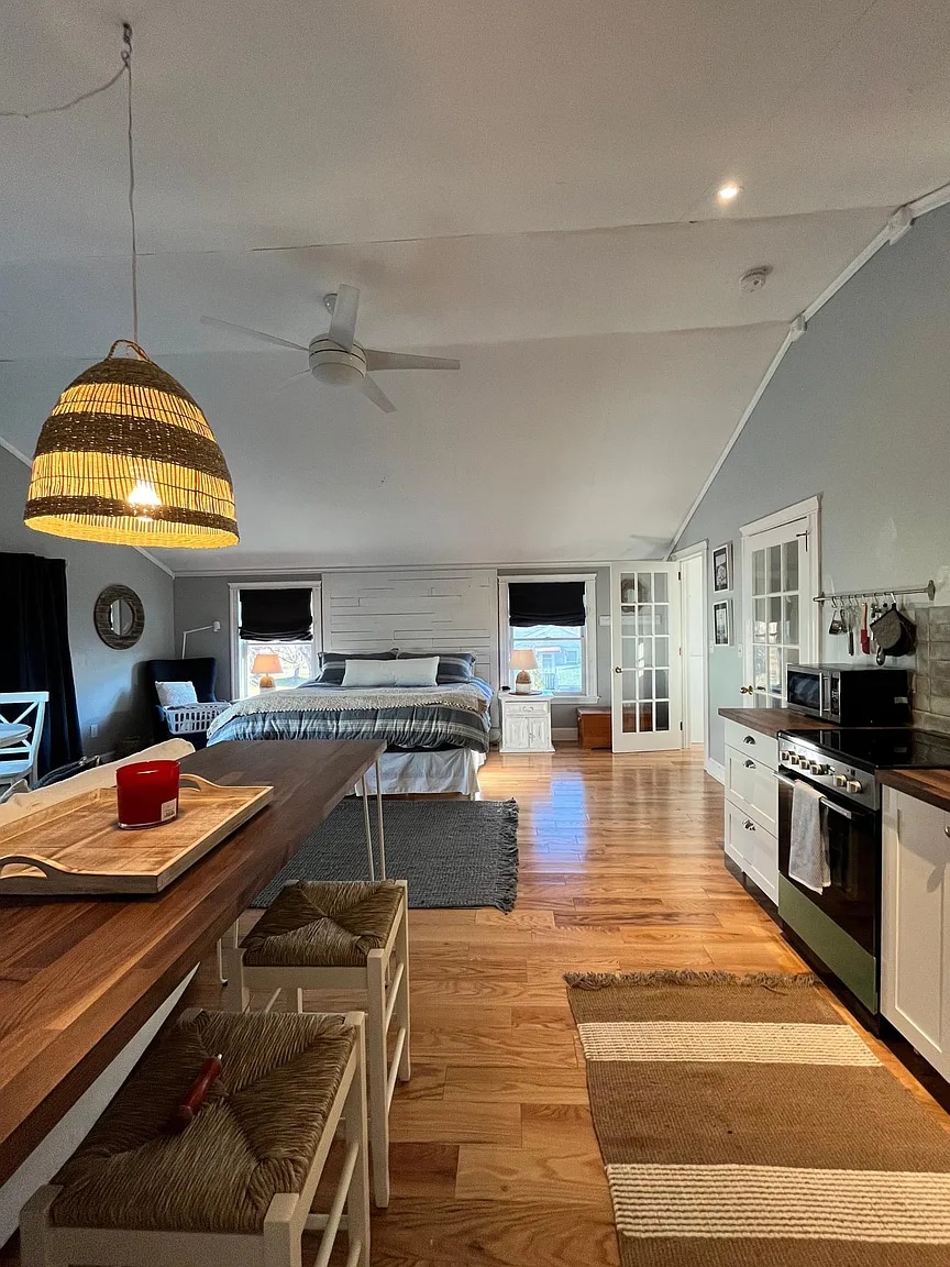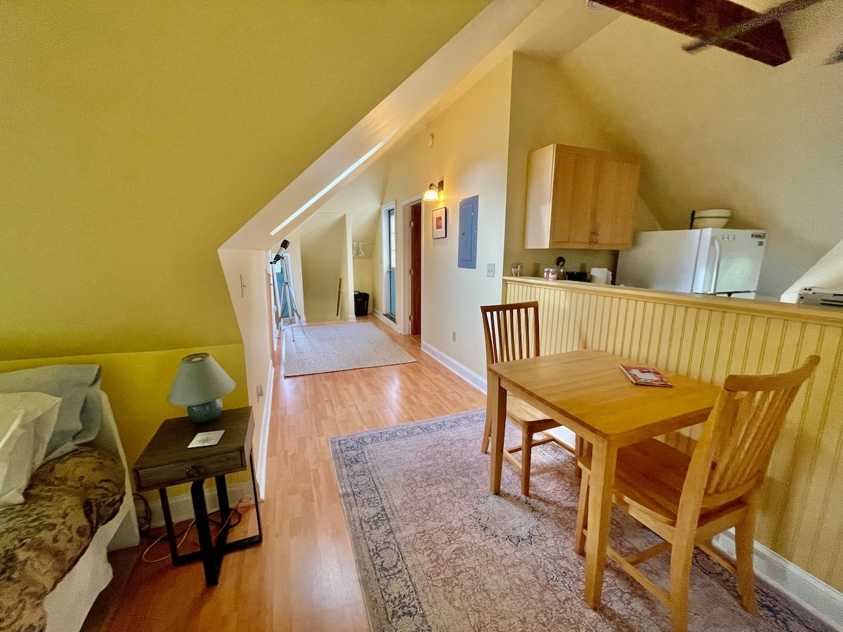 5 minutes to the beach , private deck , cozy apartment just a stone's throw from Scratch Bakery. Grab a bagel, or my personal fave, almond horseshoe, and relax on the deck stroll to the beach. One bedroom apartment on the third floor, fully equipped kitchen. Everything you need for a weekend or a winter rental. The stairs are steep and may not be appropriate if you have mobility issues. sloped ceilings . First response is alaways , "It's so much bigger than the photos show. Fast wifi .