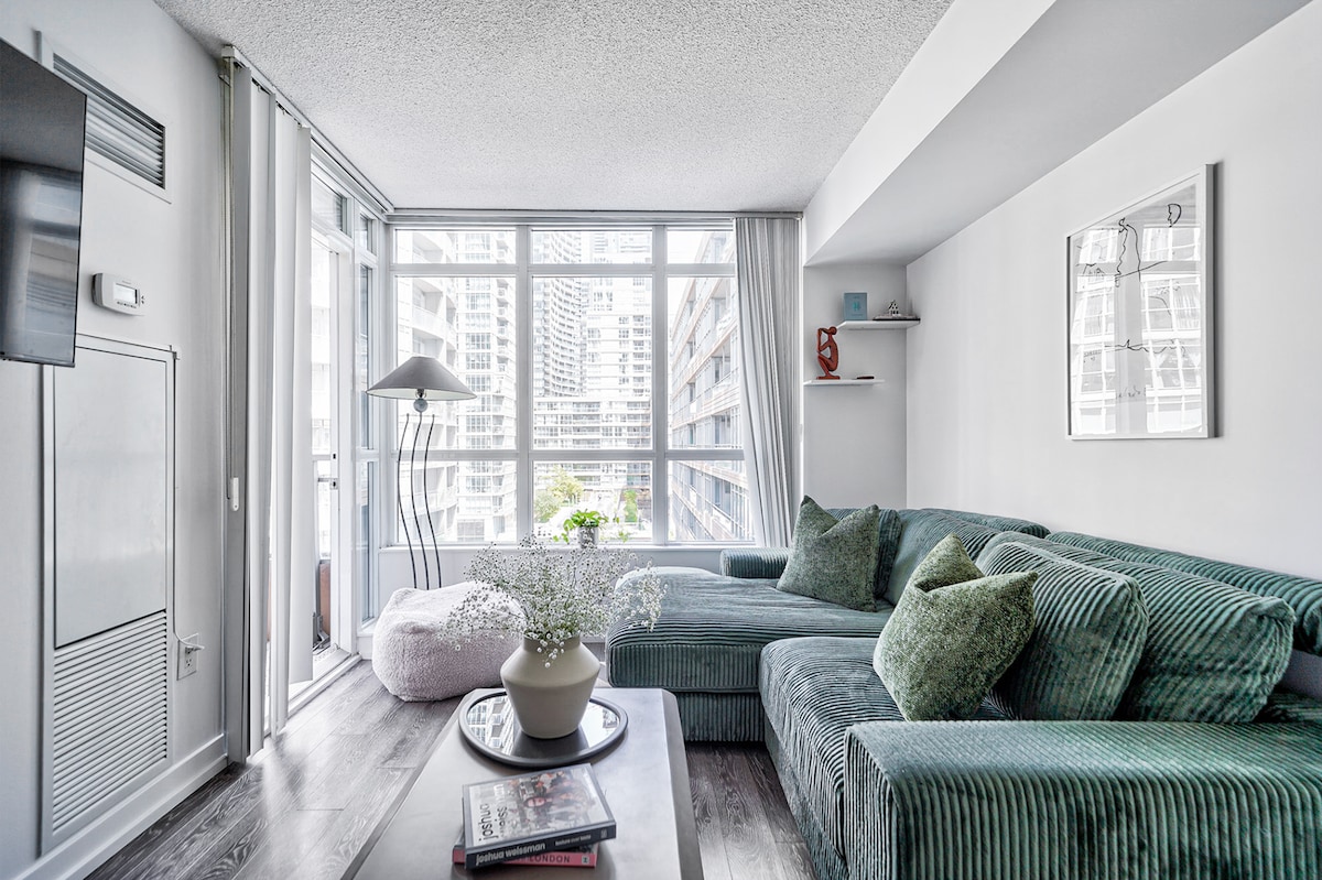 Spacious 1 bed+den modern condo located in the heart of downtown. Steps from the lake, parks, recreation centers. Short walk to CN Tower, Union Station, Rogers Center, Convention Center. → FAST WIFI Perfect for WFH, video calls, & streaming → Approx size 620ft² / 57m² → Dedicated Working space → 60" QLED TV → *NEW 2024* Fully equipped kitchen w/ set of cookware → Walking distance to dining & night life option → Minutes away from grocery, liquor stores, & city transit network (94 Transit Score)