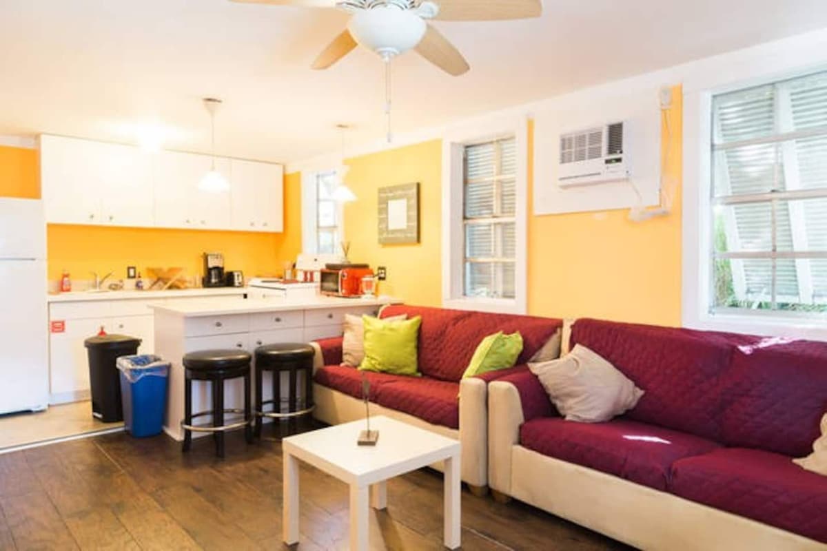 *Recent Update (2025): We’ve made a wonderful upgrade to the studio bathroom — it’s now fully enclosed with walls extending to the ceiling and a new exhaust fan for ventilation. Situated in the heart of the Cuban district, just steps from arguably the best café con leche in Key West, this bright and breezy studio apartment is minutes from everything on the island. No car needed — bikes and beach chairs are provided free of charge so you can explore at your own pace.