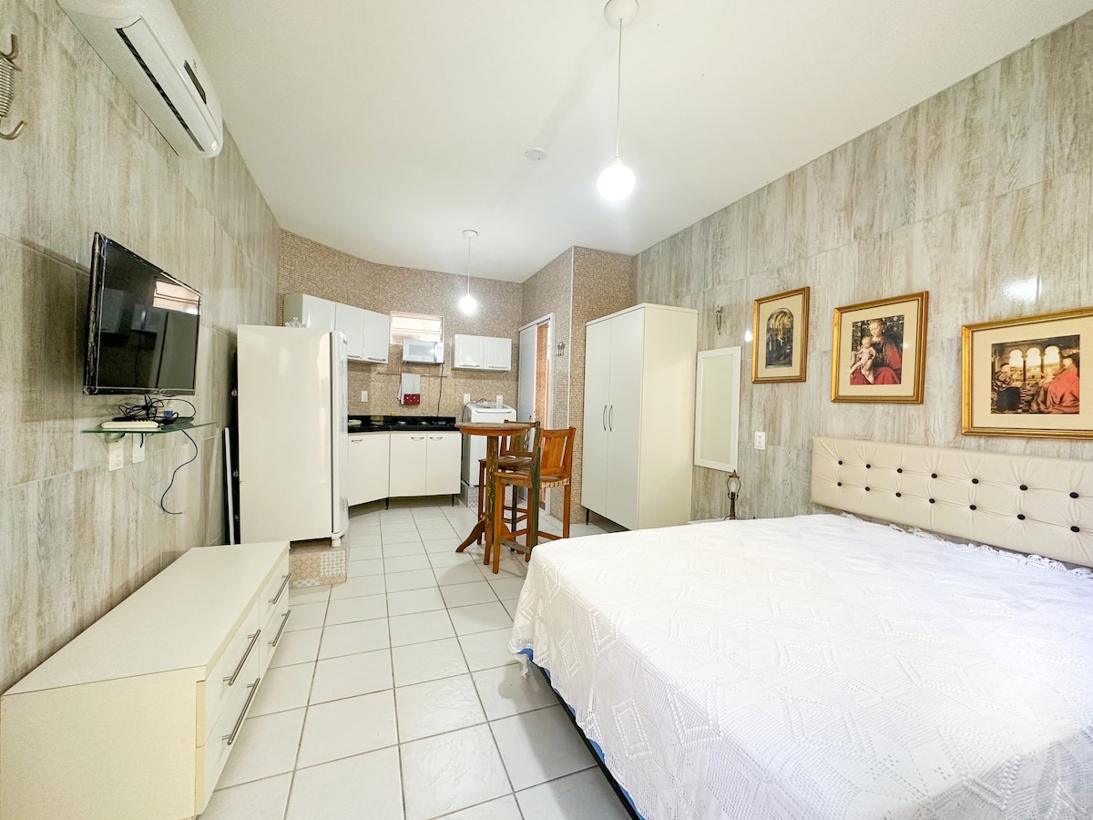 kitnet mobiliado, aconchegante e bem localizado.