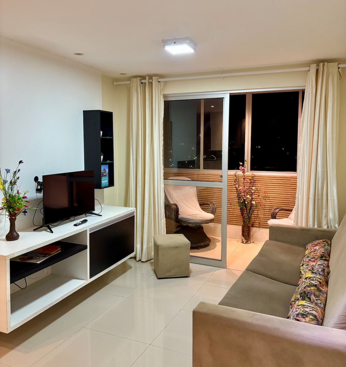 O apartamento possui 2 quartos, sendo 1 suíte, 02 banheiros com chuveiros aquecidos, ampla sala estar/jantar, cozinha completa e varanda com ampla vista para o mar e calçadão da beira-mar. Comporta confortavelmente 5 pessoas. Suíte com cama de casal e quarto com beliche + cama extra, Ambos possuem armários e ar condicionado split. Sala com sofá-cama (podendo acomodar um sexto hóspede), TV de LED e ar condicionado split.