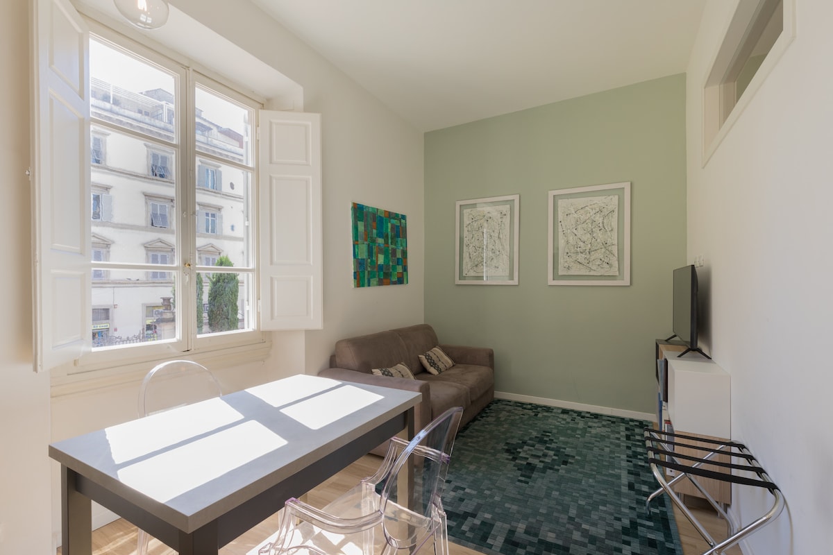 “Dante” - Immerse yourself in the essence of Florence at this refined 30 sqm studio, located on the first floor of a historic palazzo on Via dei Calzaiuoli, just steps from the majestic Duomo. A rare gem in the heart of the city, the private 35 sqm terrace offers a peaceful retreat with a table, umbrella, and chairs—perfect for open-air breakfasts, sunny lunches, or sunset aperitivos. Air conditioning, central heating, and elevator access ensure a stay of comfort and ease.