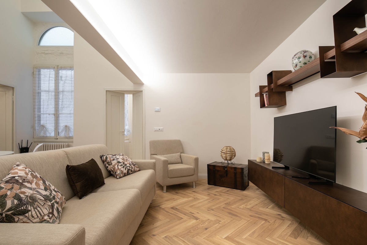 Open the large glass doors to let the scent of Tuscan herbs in; step onto the terrace and uncork a Sangiovese wine to soak in the stunning views of the Duomo. Nestled on the roofs of the authentic Santa Croce and Sant'Ambrogio neighborhoods, this romantic rooftop flat features brand-new appliances, antique and handcrafted furniture, two bathrooms, and all the amenities you need for the perfect base to explore Firenze.