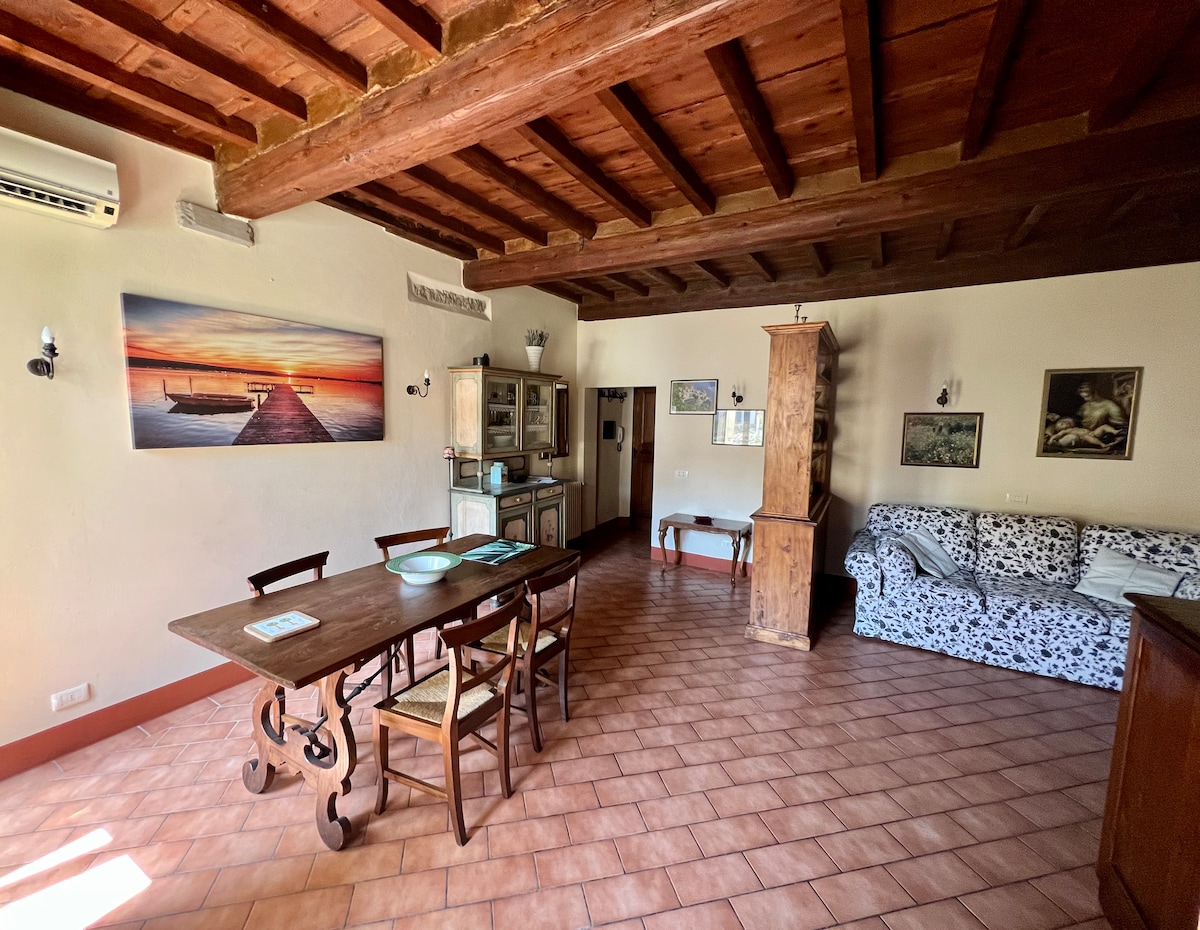 Incantevole rifugio toscano con design e tradizione Scopri l'autenticità in questo luminoso appartamento caratterizzato da eleganti travi a vista sbiancate e pavimento in cotto originale. Rilassati in un ampio salotto o nella camera matrimoniale curata nei dettagli. Comfort unico: Doppi servizi: uno moderno in marmo nero, l'altro rustico con vasca. Dotazioni: Cucina attrezzata, AC e Wi-Fi ultra-veloce. Un'oasi di pace perfetta per il tuo soggiorno. Prenota ora!