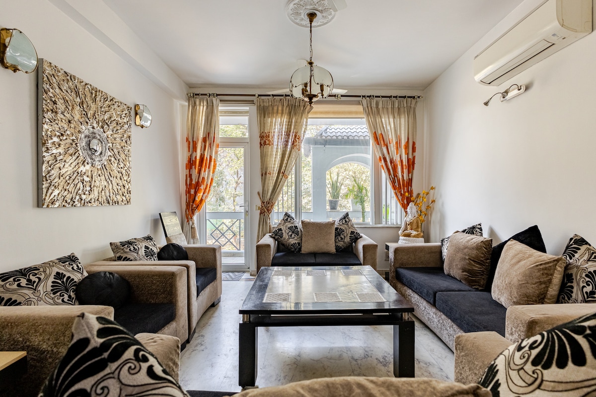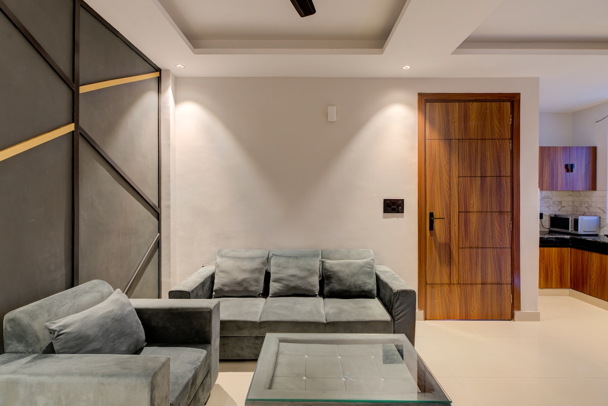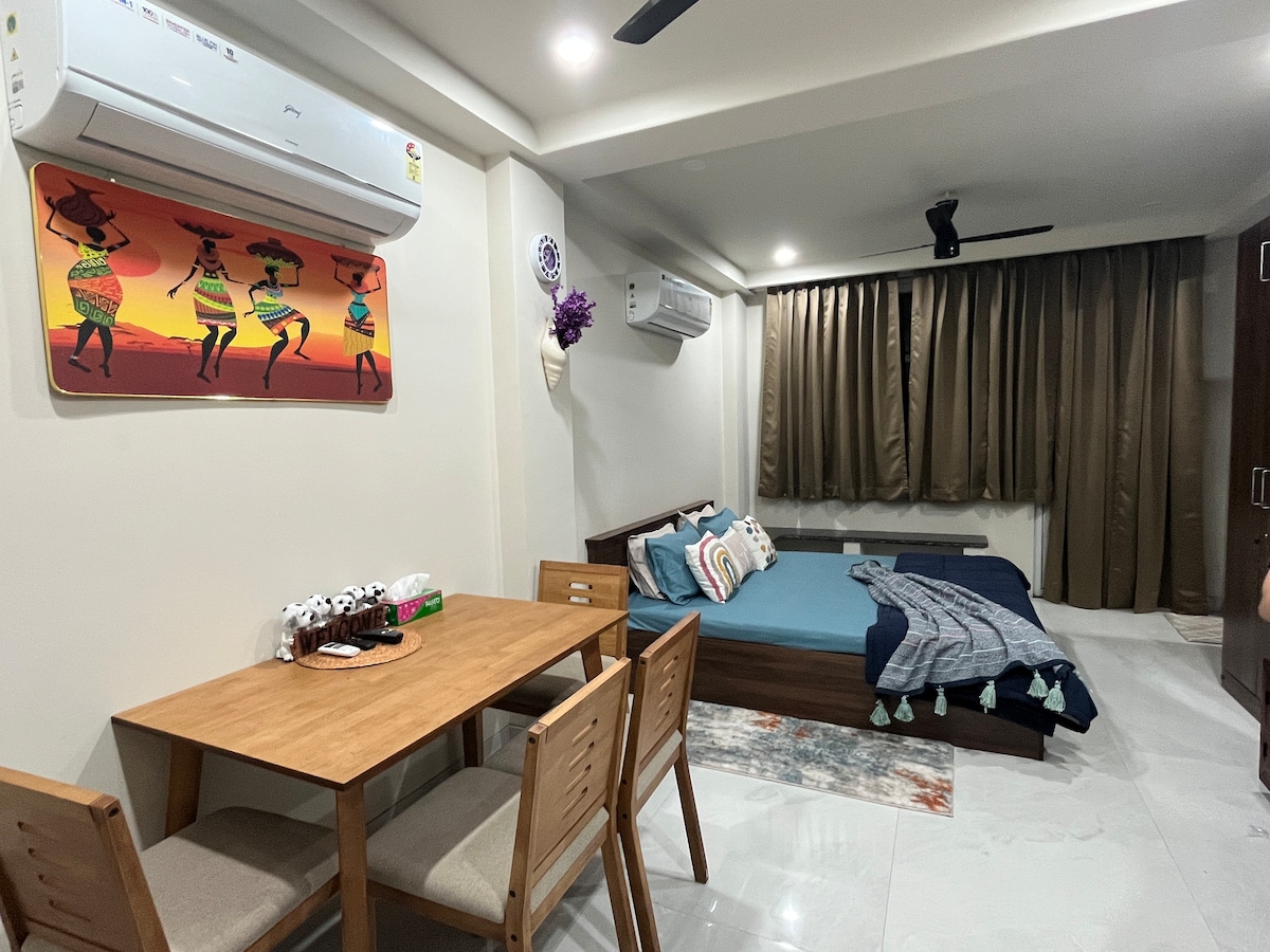Premium 1BHK Service Apartment in Sector 43, Gurgaon with AC in living room & bedroom, plus a kitchenette with induction, microwave & cutlery. In a posh area, walking distance to Gold Souk Mall & Shalom Hills School, 2.2 km from Millennium City Centre Metro & 2.1 km from Fortis Hospital. Foreign guests are welcome. Early check-in will be subject to availability and chargeable Rs.500 as well as late checkout will also be the same with ₹500 added for every 3 hrs thereafter.