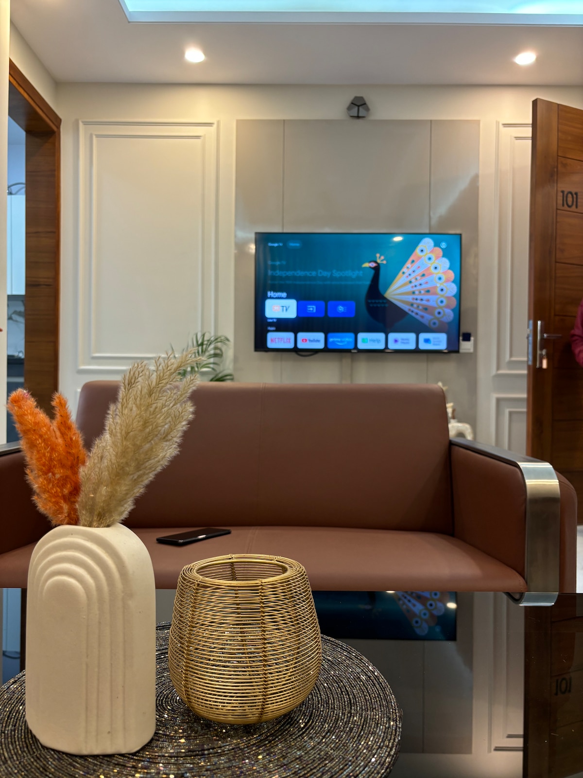 Experience comfort and style in a sanctuary designed for work and relaxation. Rest on a Wakefit orthopedic mattress and enjoy warm ambient lighting. Stay productive with an ergonomic workspace and unwind with two 42-inch TVs. The attached bathroom offers premium toiletries and a lit vanity mirror. Cook effortlessly in a fully equipped kitchen. Relax on the sofa in a space where peace, productivity, and lifestyle blend perfectly.