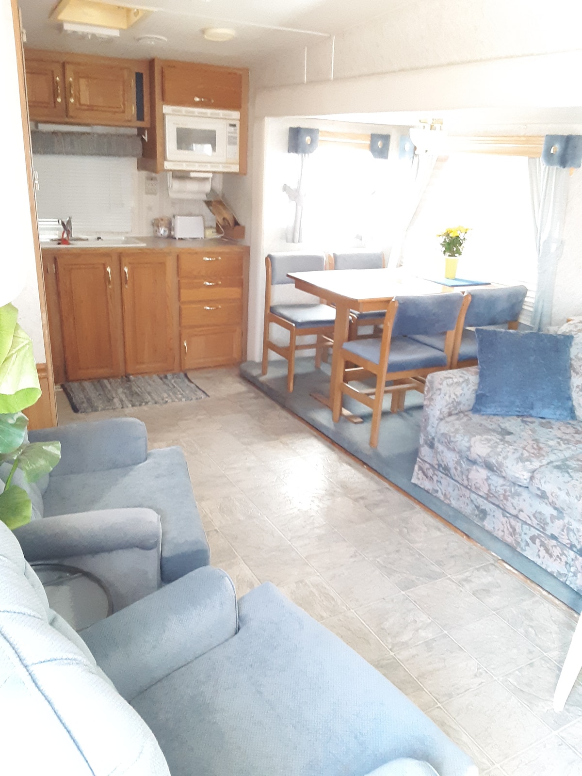 This is an older fifth wheel, perfect for those looking for a basic, clean, and budget-friendly place to stay. It’s not luxury but has the essentials: a queen mattress, a sofa that converts into a bed, a simple kitchen, bathroom, and comfortable sleeping arrangements for 2 people. The home is kept cool and heated with a mini split system for your comfort. Please take in to consideration this is a smaller RV about 25 feet.