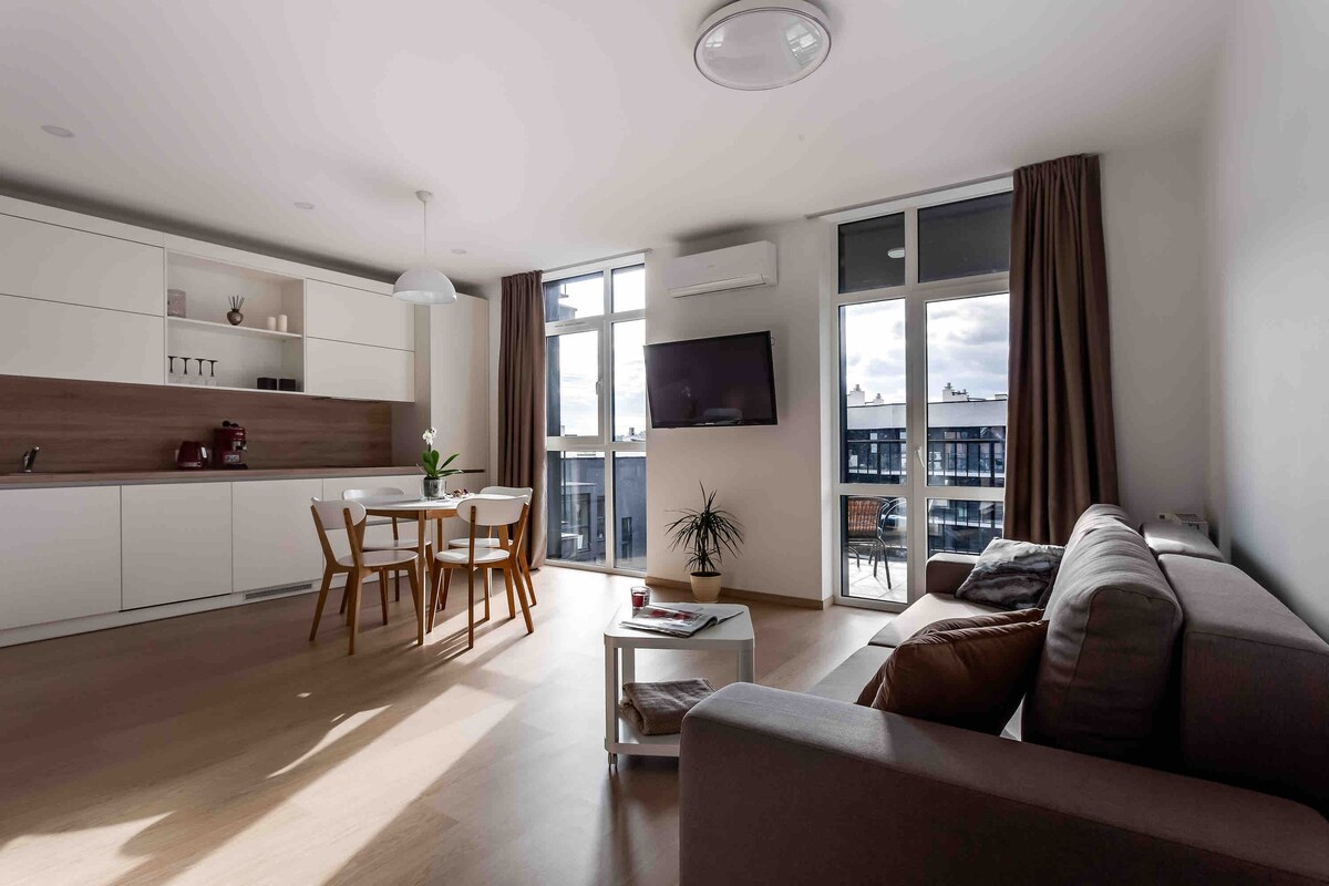 位于新大楼内,提供免费停车位,适合2-4-6人的大家庭和朋友团体入住。 距离New point购物中心和Epicenter购物中心1公里,距离lbiv opera 1.6公里。 适合周租、月租和长期租赁
