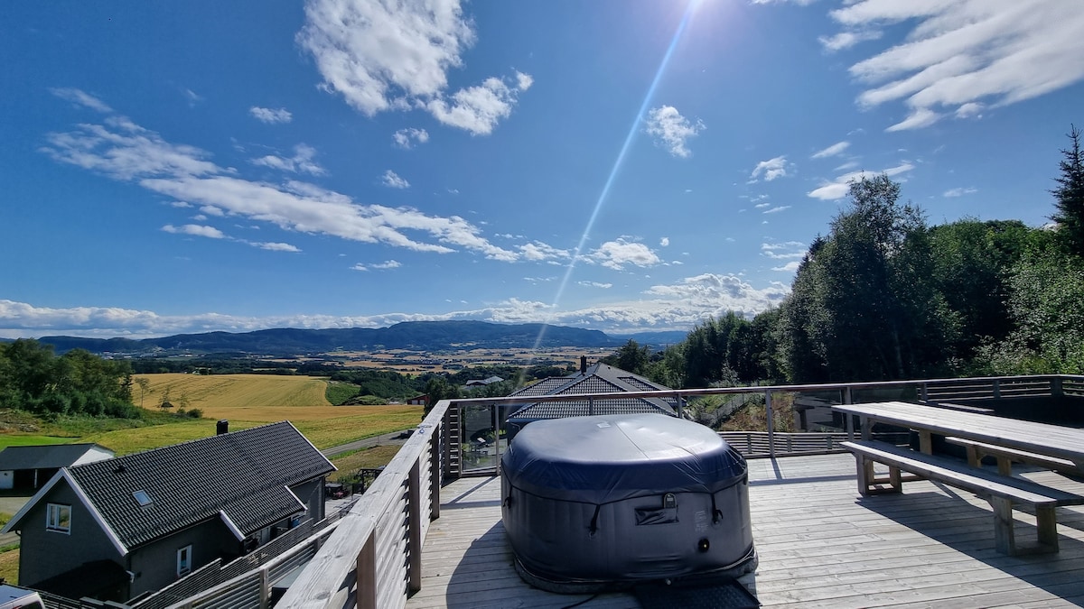 Nyt fantastisk panoramautsikt fra en nyoppusset og romslig leilighet over to etasjer, 2.etasje og loft. Beliggende landlig og fredelig på Ranheim, med to solrike terrasser. Kort vei til marka og kun 10 min til Trondheim sentrum. Leiligheten har tre soverom og en sovesofa, plass til opptil 8 personer. Perfekt for familier eller vennegrupper som ønsker komfort, ro og nærhet til både natur og by. Gratis parkering, elbil-lader, WiFi, fullt utstyrt kjøkken, to stuer, sengetøy og håndduker inkludert.