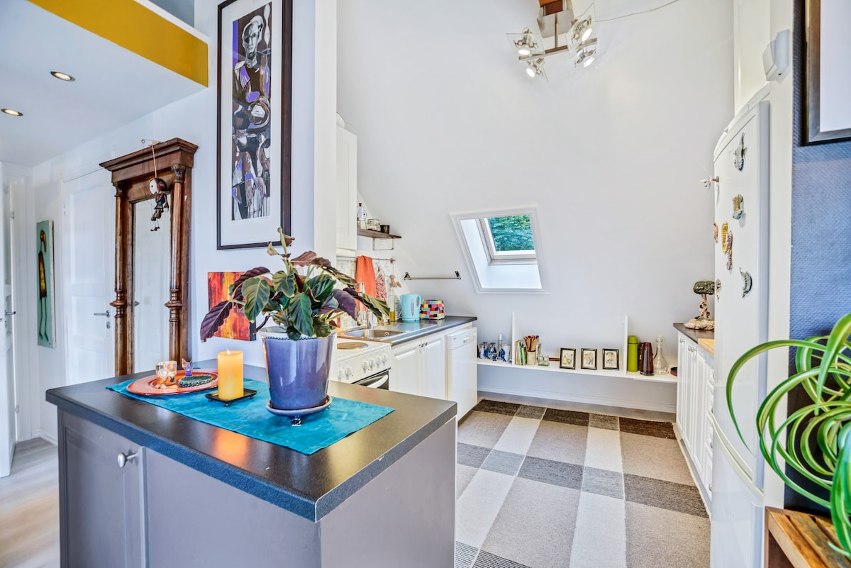 (See the MAP in the pictures for the exact location) 2 rooms with kitchen/bathroom in loft apartment (3rd fl.) Cozy kitchen with everything you need, including dishwashing machine. -------------- (Se kart i bildene for eksakt lokalitet). 2 roms med kjøkken&bad i loftsleilighet (3. etg.) Koselig kjøkken med alt du trenger inkl oppvaskmaskin.