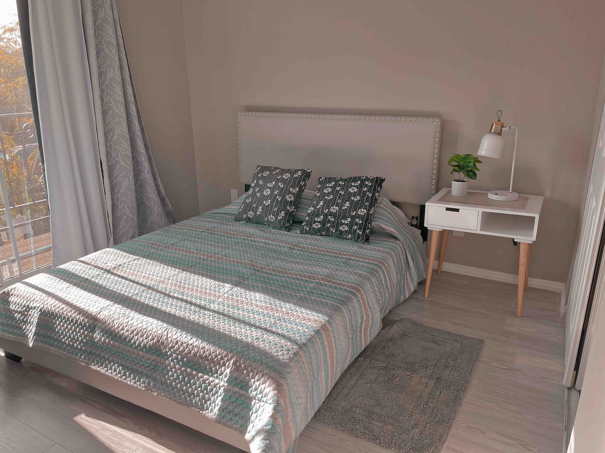 Our spacious guest suite has its own private entrance, comfortable pillow-top king size bed, work-friendly laptop desk, hi-speed wifi, spa bathroom with heated floor, mini fridge, and microwave. The guest suite is part of the main home, but there are no shared spaces and the areas are separated by a locked solid wood door & noise-dampening cushions. Our guest suite is ideal for couples visiting family in the neighborhood.