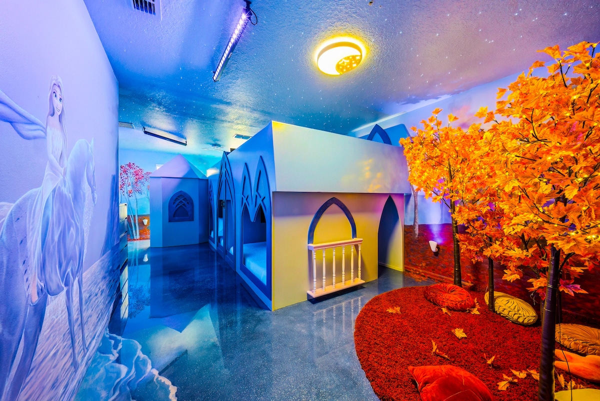 Unique and unforgettable Orlando vacation home for 26, just 10 miles from Disney! This professionally designed retreat features a private pool & spa, an enchanted forest-themed game room, an Indiana Jones-themed movie theater, and a tropical outdoor lounge. Your stay includes full access to the Windsor Island Resort waterpark, lazy river, and slides. Perfect for large families and groups seeking a hassle-free getaway with premium amenities and themed bedrooms that will delight all ages.