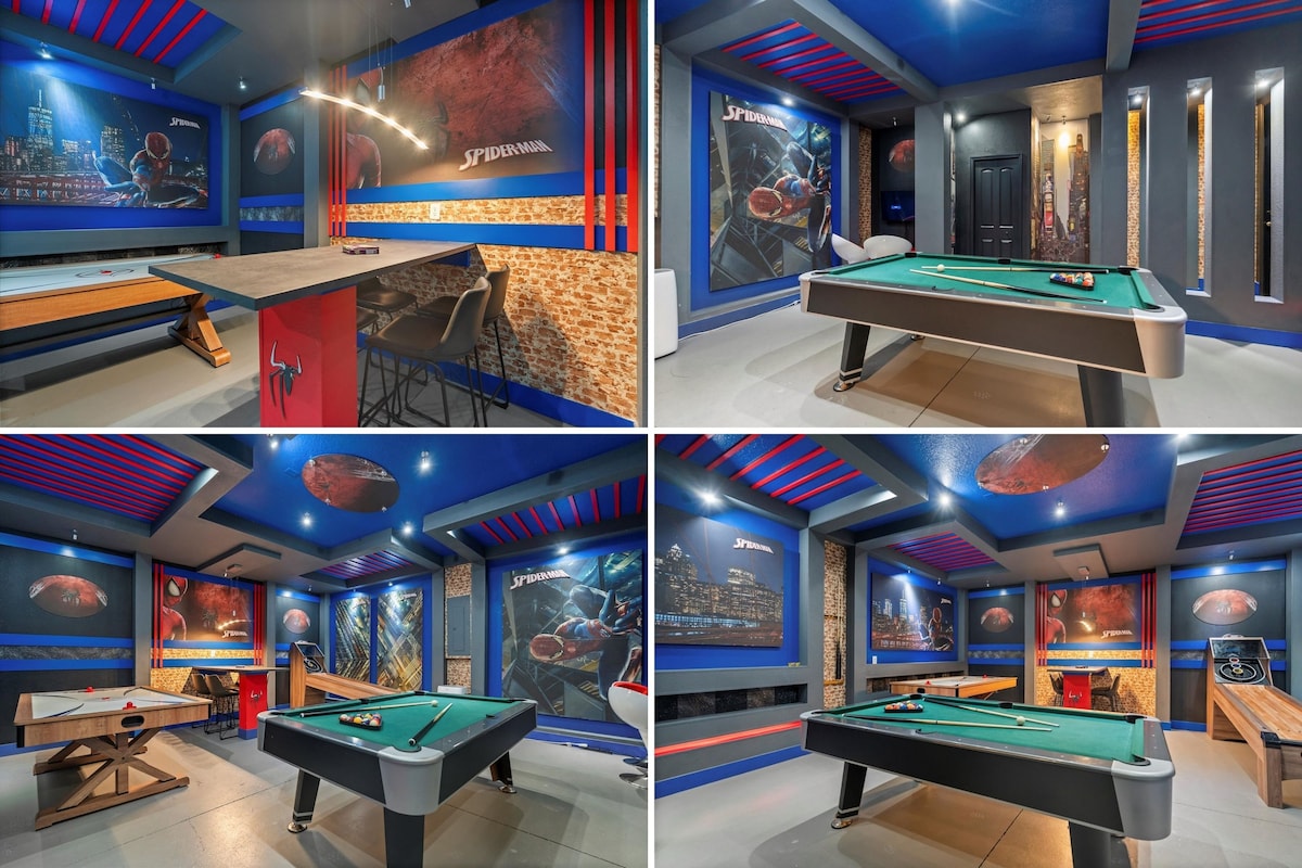 The perfect balance of STYLISH DESIGN, LUXURIOUS COMFORT, & ENDLESS ENTERTAINMENT in the stunning 3.5 square mile Reunion Resort. You will have your own private pool, spa, movie theater - game room, 3 master suites, 3 incredible themed bedrooms (MARVEL, FROZEN II, NASA) for kids or adults, the latest Xbox Series X game station, a 2500 ft2 pool deck overlooking a beautiful forest and pond, fire pit, & billiards table, minutes to Disney.