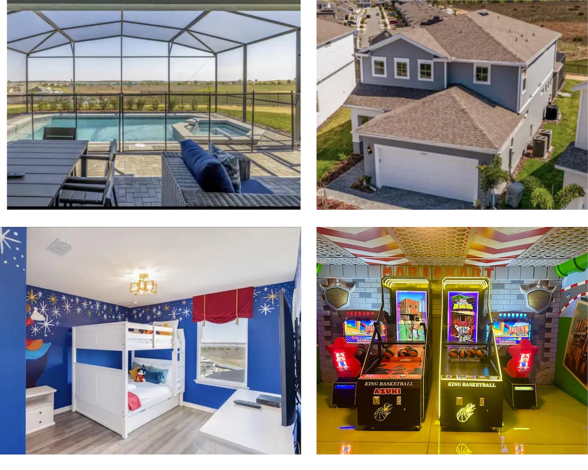 泳池 + 游戏室,距离迪士尼仅 10 分钟路程,可容纳 10 位房客