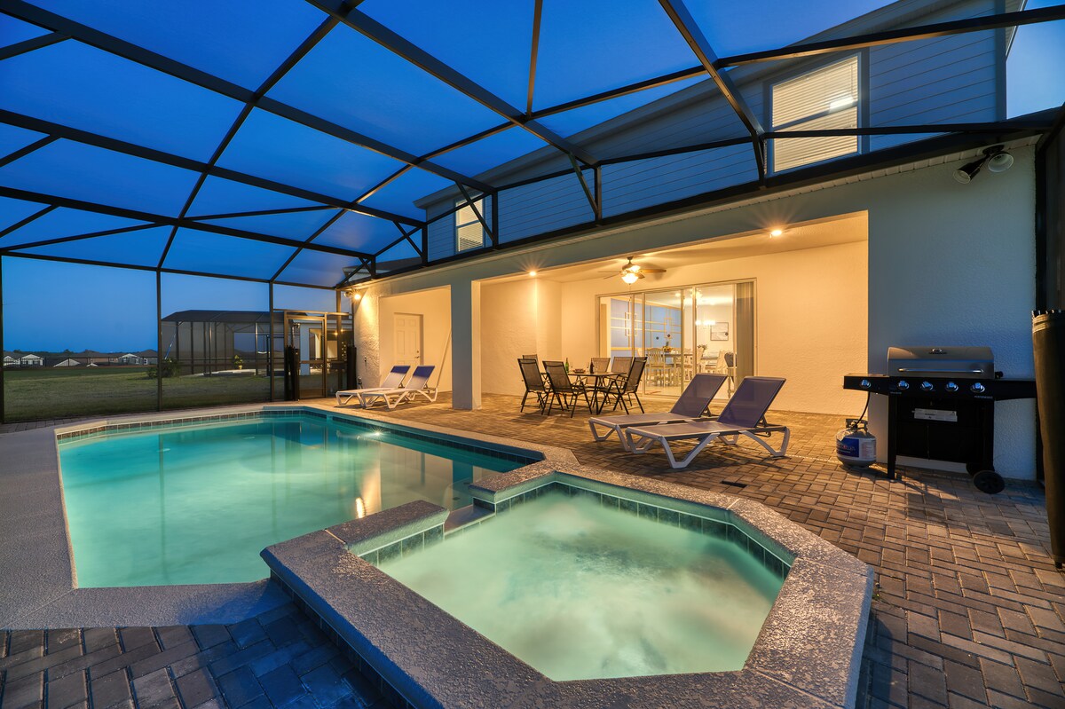 Bring the whole family to this great place with lots of room for fun. Modern home located in Encore at Reunion. This fully furnished 6 bedroom, 6 bathrooms and your own refreshing heated pool and heated spa. The kitchen is modern This wonderful open floor plan is great for large families or guests to enjoy. Relaxation at its finest can be experienced outdoors by the pool and spa overlooking the extended brick-paved pool deck. Your very own tropical paradise