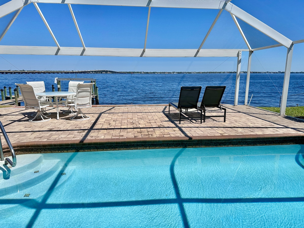 • Beautifully fully furnished waterfront house with private dock. 3b/2 full bath • Spacious outdoor patio with stunning water view. •Great location! 10 mins to downtown Cape Coral. 30 mins to Fort Meyers beach. 25 mins to Ft Meyers airport • Perfect for boaters, no bridge to open water, boat ramp within walking distance. Fishing, dolphin watching anytime! •Office for remote working (WFH) •Fully stocked kitchen, outdoor grill •TV, WiFi, pool • Everything is ready for you to stay.
