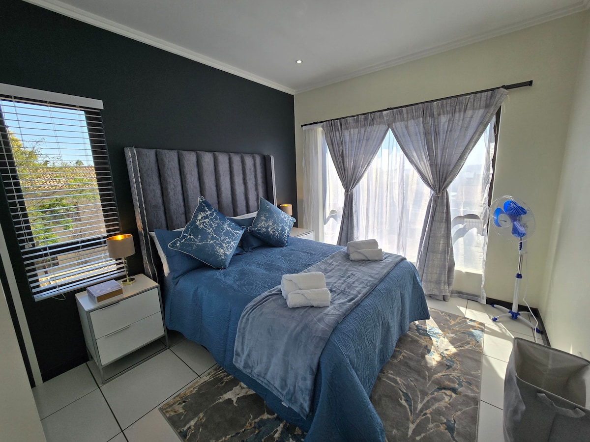 We welcome you to relax in our calm and luxurious space situated in a quiet section of Fourways. The apartment is uniquely and tastefully designed with amenities that radiate style and comfort. Treat yourself to this stunning apartment with a queen size bed, a fully equipped kitchen and a modern bathroom. Unwind on the patio or on the couch and enjoy a TV with Netflix and Youtube. The apartment has electricity backup that runs the TV and the Wi-Fi. Book your stay today and indulge in luxury.
