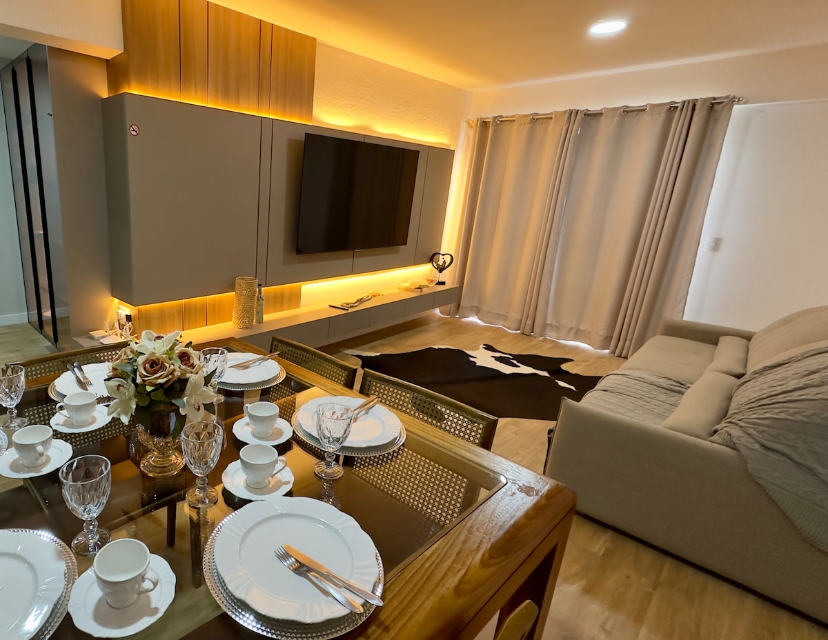 Apartamento novíssimo, pensado e decorado com muito carinho por mim, desde a escolha dos móveis ao quadro que decora a sala. Um local de aconchego e descanso, para casais, famílias, ou viajantes solo. Localizado no centro de foz, ao lado de um mercado e uma farmácia, com cafés, restaurantes, academias e bares a uma quadra de distância. Meu apt tem todas as comodidades necessárias para tornar sua hospedagem memorável em Foz do Iguaçu!
